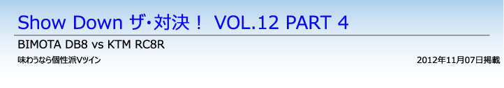 RC8Rの場合、エンジンはVツインでフレームはクロモリとくれば、ドゥカティや今回のライバルであるビモータなどのイタリアンと似ているようだが、その実、Vバンク角(75度)やフレームの作りも独自のレイアウトを採用するなど、知れば知るほど興味深い。
